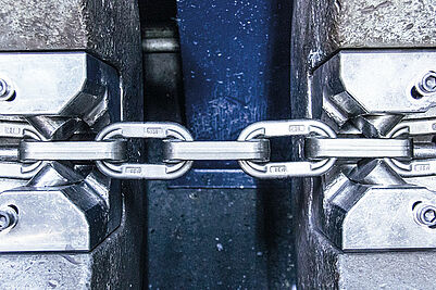 Friction welding is not a welding process in the traditional sense. Heat is generated through mechanical friction between the chain link components until the material plasticizes. A lateral force is applied to exactly fuse the components to a whole chain link.