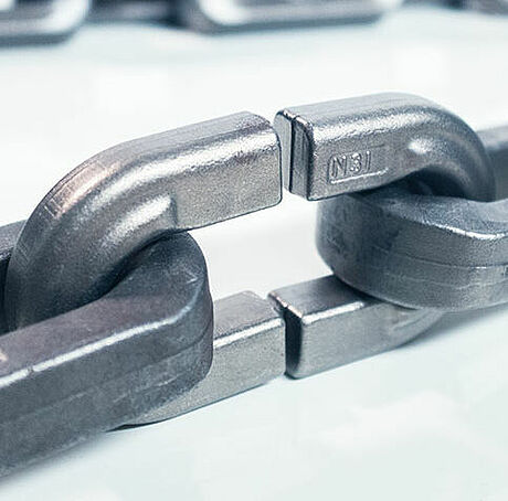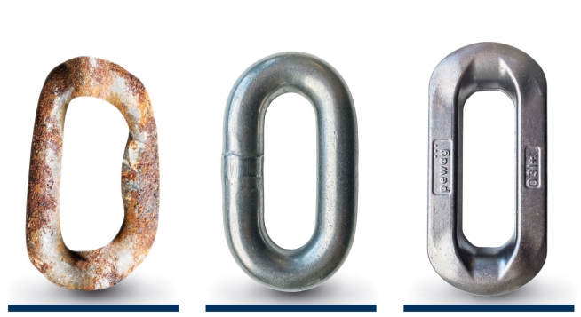 Friction welded chain is produced from forged steelcomponents, unlike round steel chain which begins with drawn steel wire or rolled bars. The use of forged components offers the ability to increase the section modulus in areas of high stress or wear and eliminates the risk of tension cracks, which can occur during the bending process of round steel chains.
