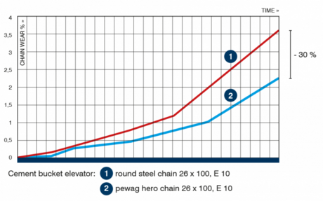 - The load specific geometry of pewag hero chain has increased interlink contact area and more than twice the wear volume of a conventional chain. This leads to significantly reduced contact- and maximum stress, better performance and approximately 30% longer service life.