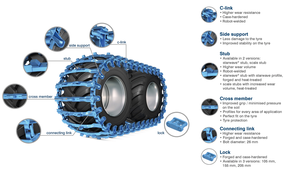 Thanks to the innovative pewag starwave® profile and the asymmetrical positioning of the stubs, traction is considerably improved. Independent of the characteristics of the terrain, the asymmetrically arranged stubs make for reliable grip. In addition, the individual cross member profiles improve stability on all subsoils and increase cross-country mobility even if the machine is overloaded.